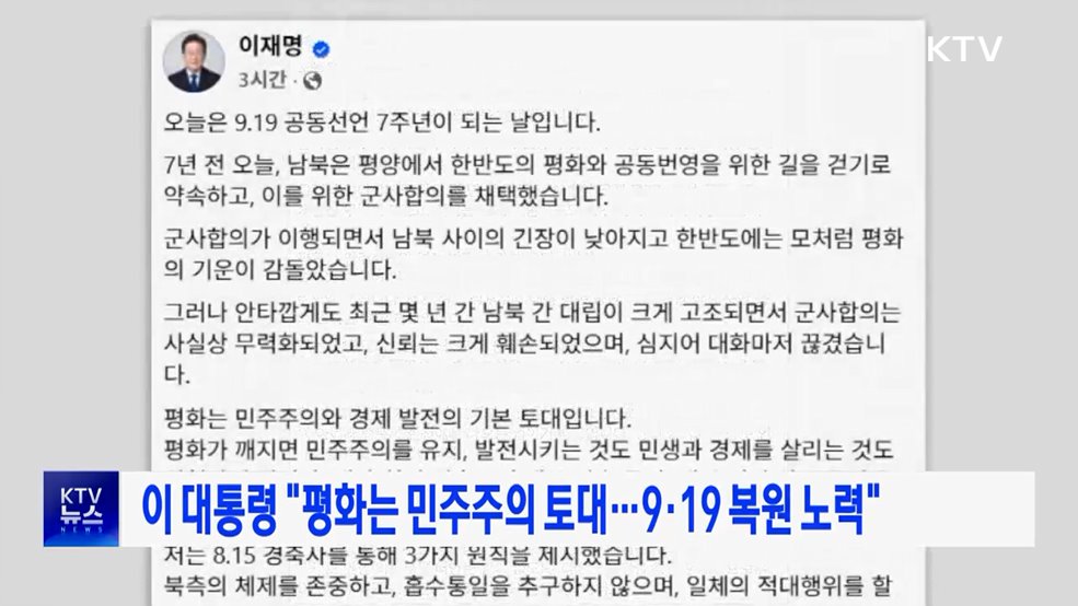 [KTV 뉴스] 이 대통령 "평화는 민주주의 토대···9·19 복원 노력" 2025.09.19