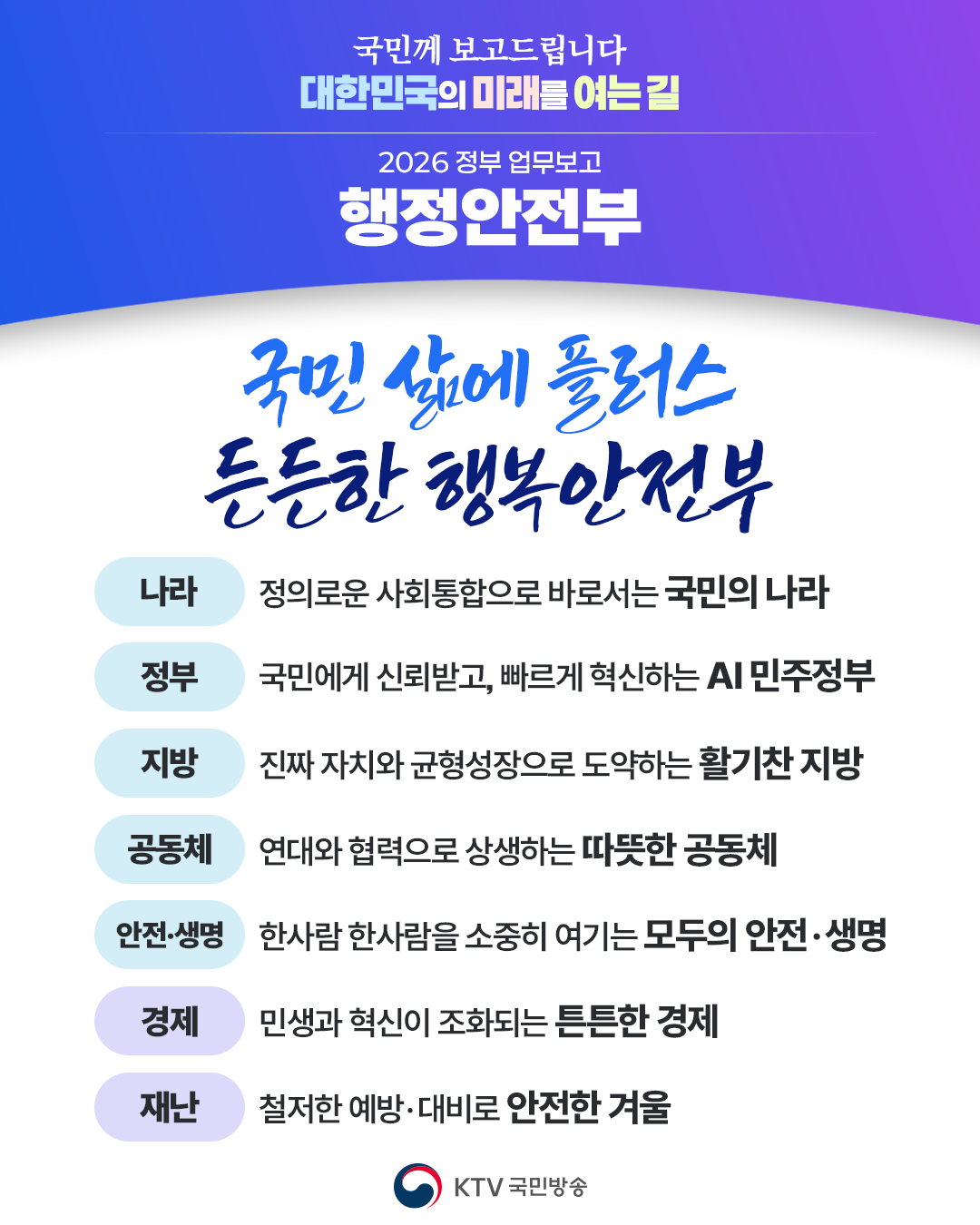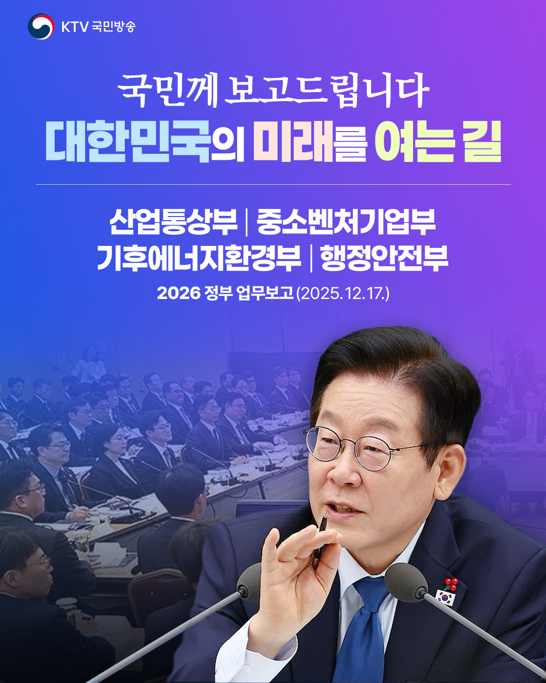 이날 업무보고는 산업통상부·중소벤처기업부·지식재산처, 기후에너지환경부·기상청·원자력안전위원회, 행정안전부·경찰청·소방청·인사혁신처 순으로 업무보고가 있었습니다.