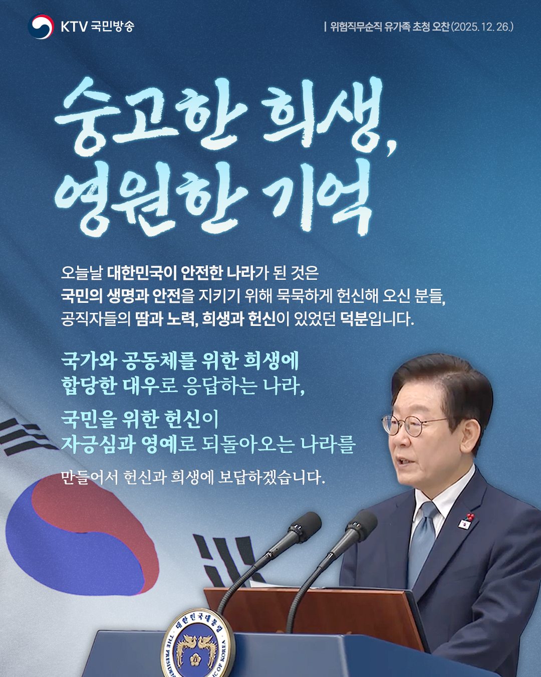 이재명 대통령은 26일 경찰 공무원, 소방 공무원, 군무원, 해양경찰 공무 수행자 등 위험직무 순직자 18분의 유가족 35분을 초청해 위험직무 순직 유가족 초청 오찬 행사를 가졌습니다.