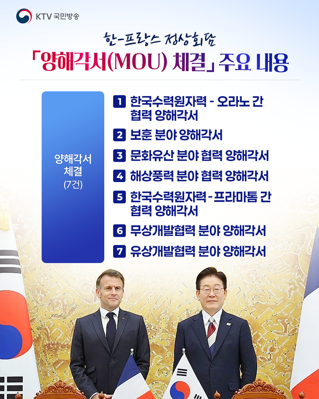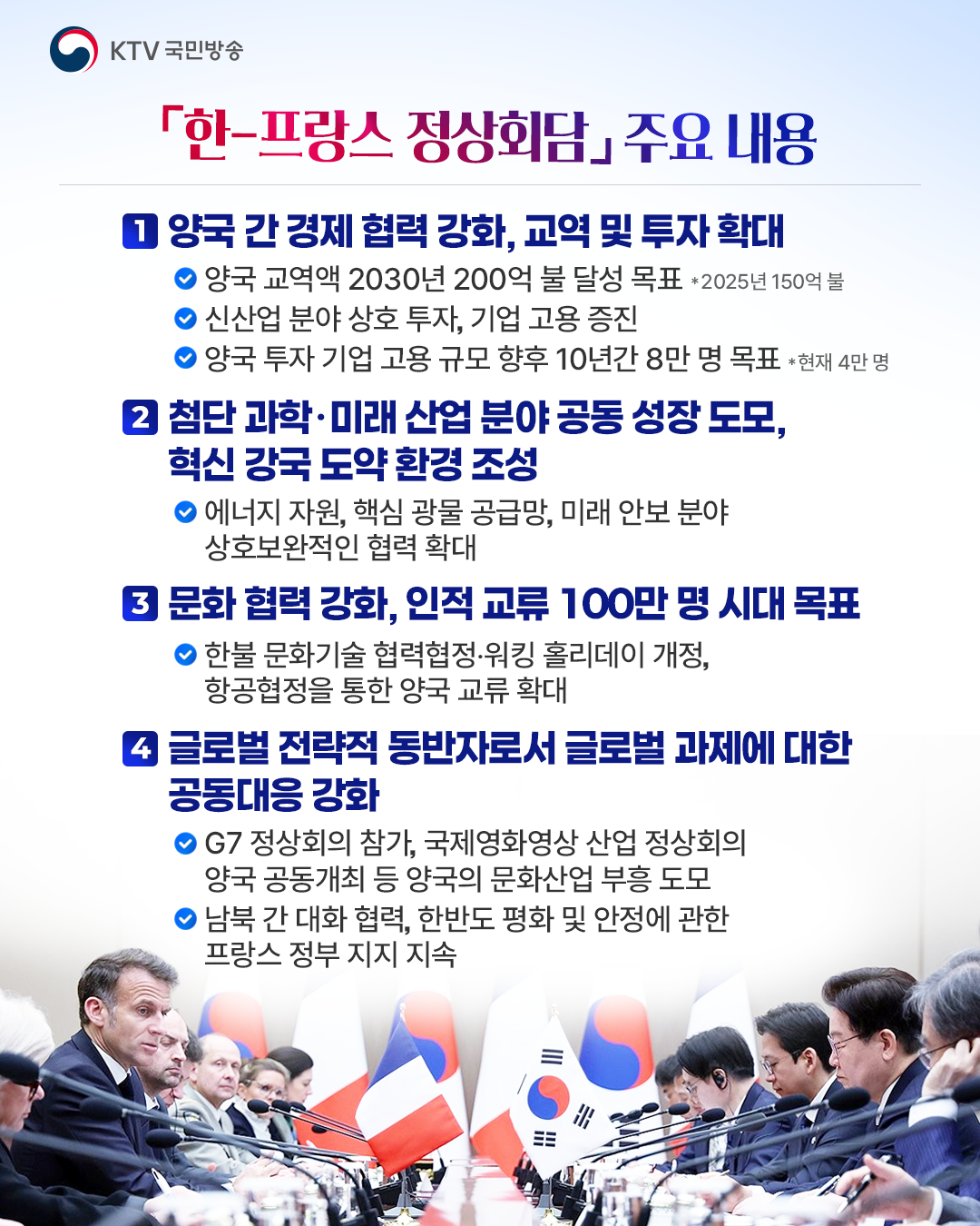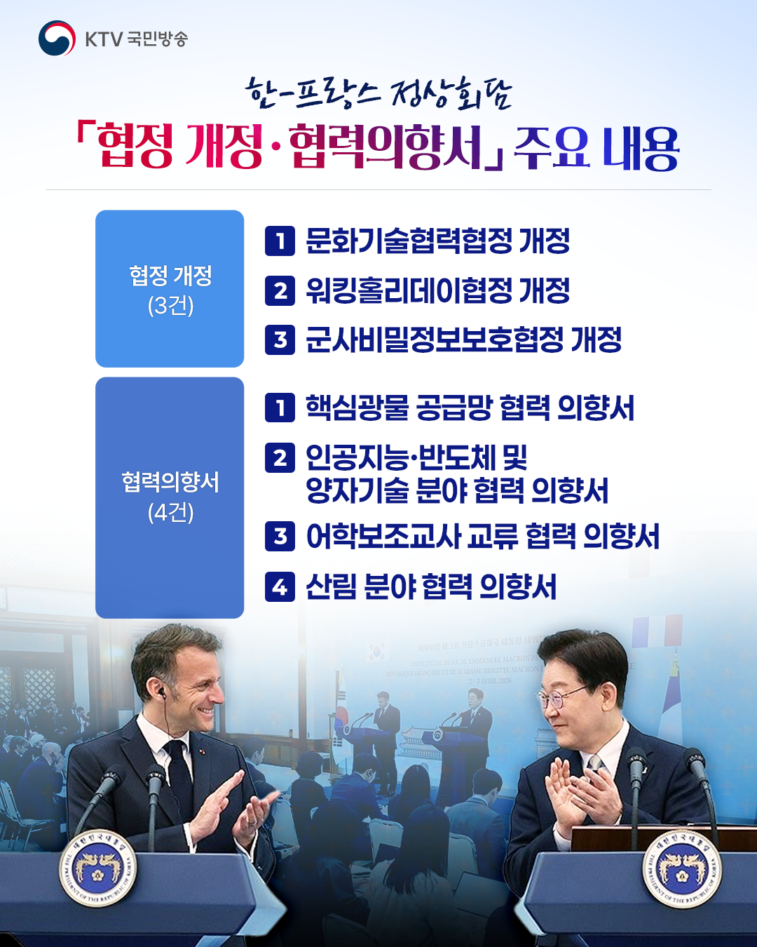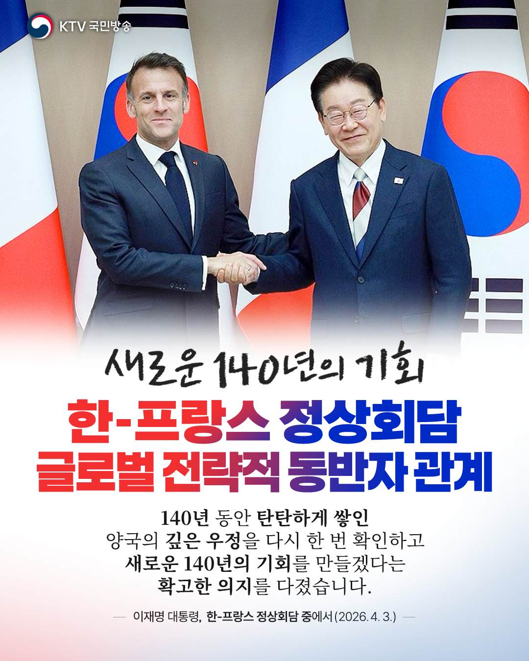 이재명 대통령은 4월 3일, 에마뉘엘 마크롱 프랑스 대통령과 정상회담을 갖고 양국 관계를 ‘글로벌 전략적 동반자 관계’로 격상했습니다.
