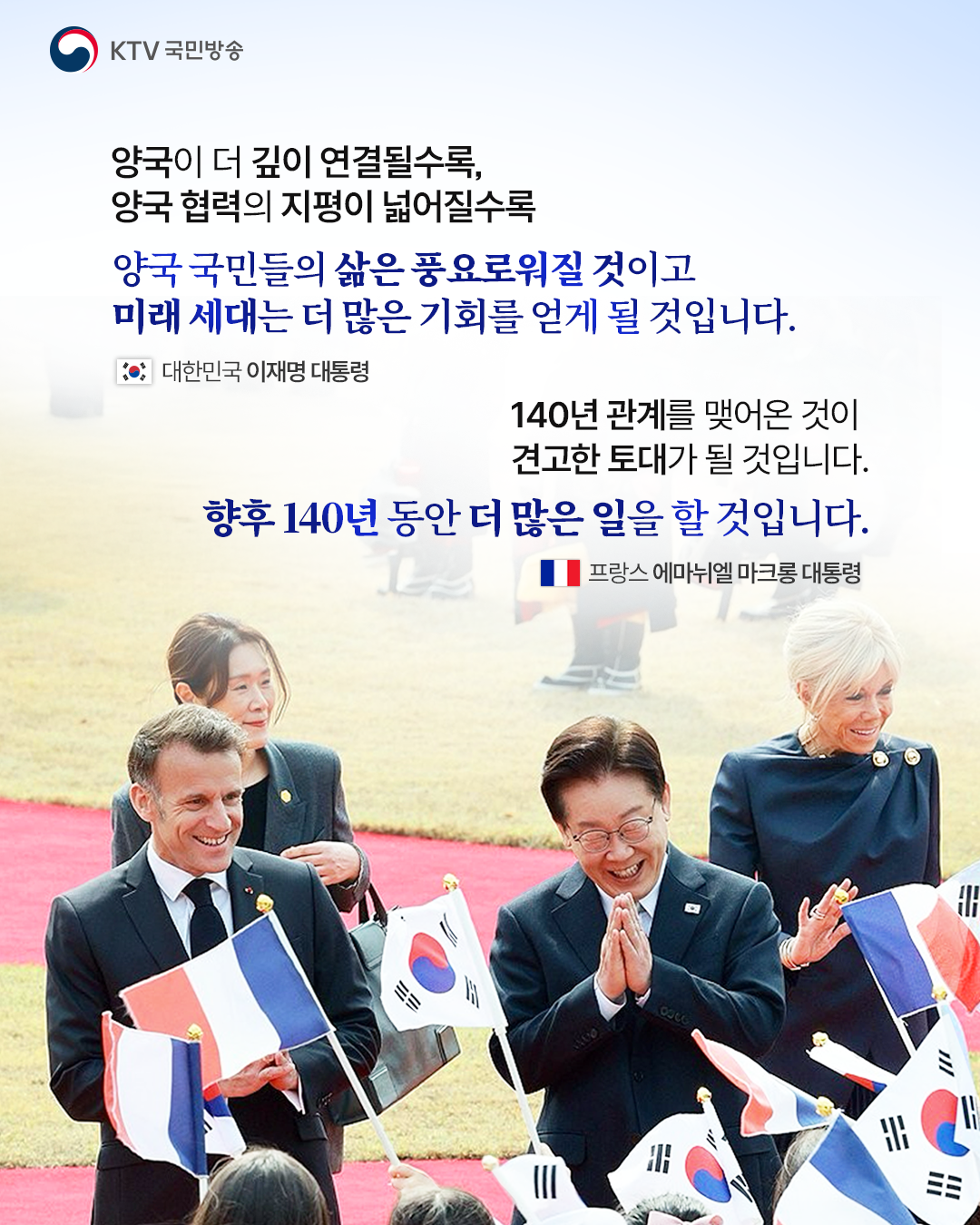 이 대통령은 “프랑스는 140년 동안 우리 대한민국의 곁을 든든하게 지켜준 친구”라고 밝히며 양국 관계의 깊은 신뢰를 강조했습니다. 이어 “양국 관계를 글로벌 전략적 동반자 관계로 격상하기로 했다”라고 전하며 다양한 분야의 양국 협력이 새로운 단계 진입을 선언했습니다.