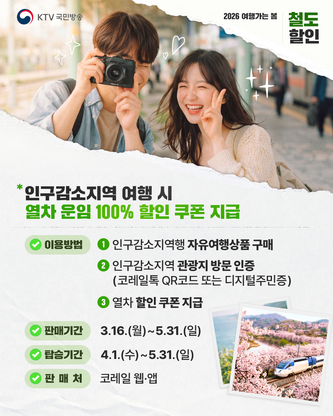 - 인구감소지역 여행 시 열차 운임 100% 할인 쿠폰 지급